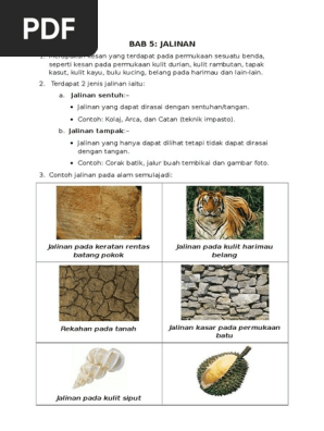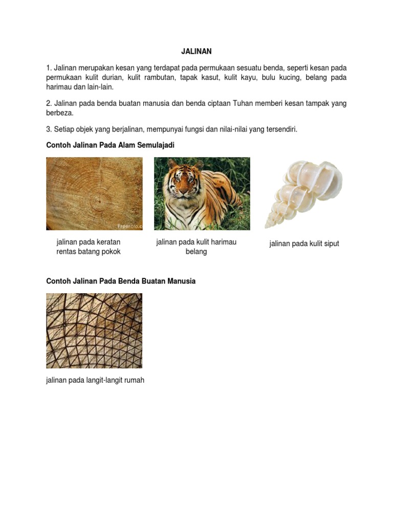 Unsur seni Other contents. Jalinan merupakan kesan yang terdapat pada permukaan sesuatu benda seperti kesan pada permukaan kulit durian kulit rambutan tapak kasut kulit kayu bulu kucing belang pada harimau dan lain-lain. View RUPA-2pdf from EDU 3093 at IPGK TUN HUSSEIN.