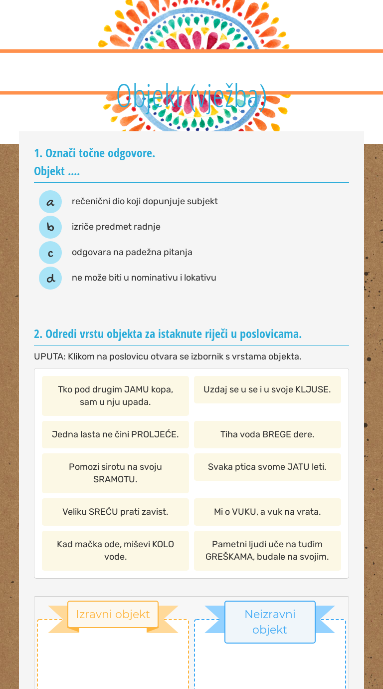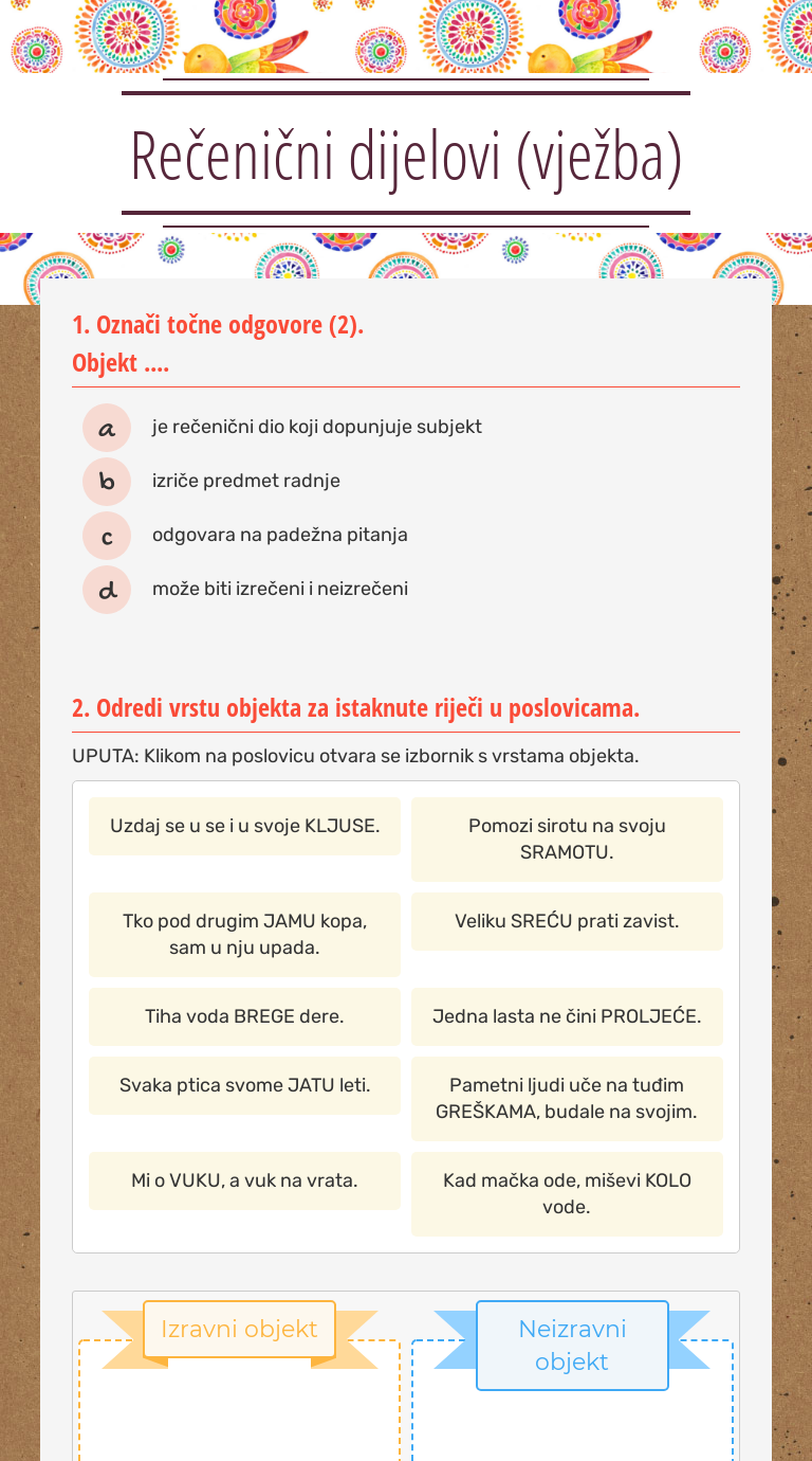 Wizerme free interactive worksheet - Služba riječi u rečenici vježba by teacher Marijana Đuraš. Neizravni objekt izriče predmet radnje na koji radnja ne prelazi izravnoPrepoznaje se kao imenica ili neka druga imenska riječ u genitivu dativu lokativu ili. Objekt izrečen u ostalim kosim padežima naziva se neizravnim objektom i veže se za neprijelazne glagole.
