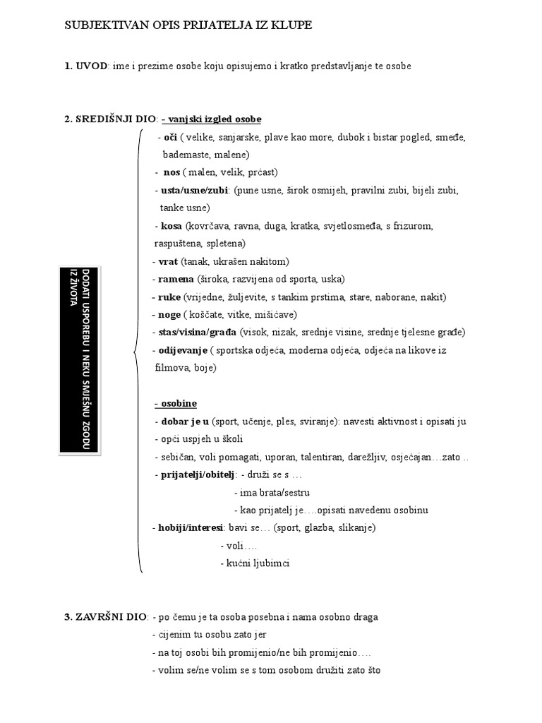 Nastavni listić - subjektivni opis osobe. Opis njegova izgleda i odjeće socijalna opisuje društveno podrijetlo lika način na koji sredina utječe ne. Ime i prezime osobe koju opisujemo i kratko predstavljanje te osobe.
